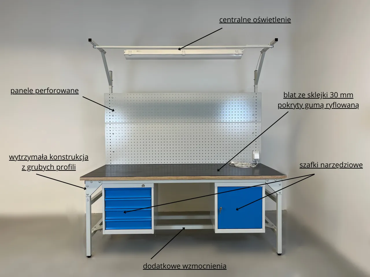 - Regulowane blaty robocze oferują elastyczność i komfort dostosowania do różnych zadań.